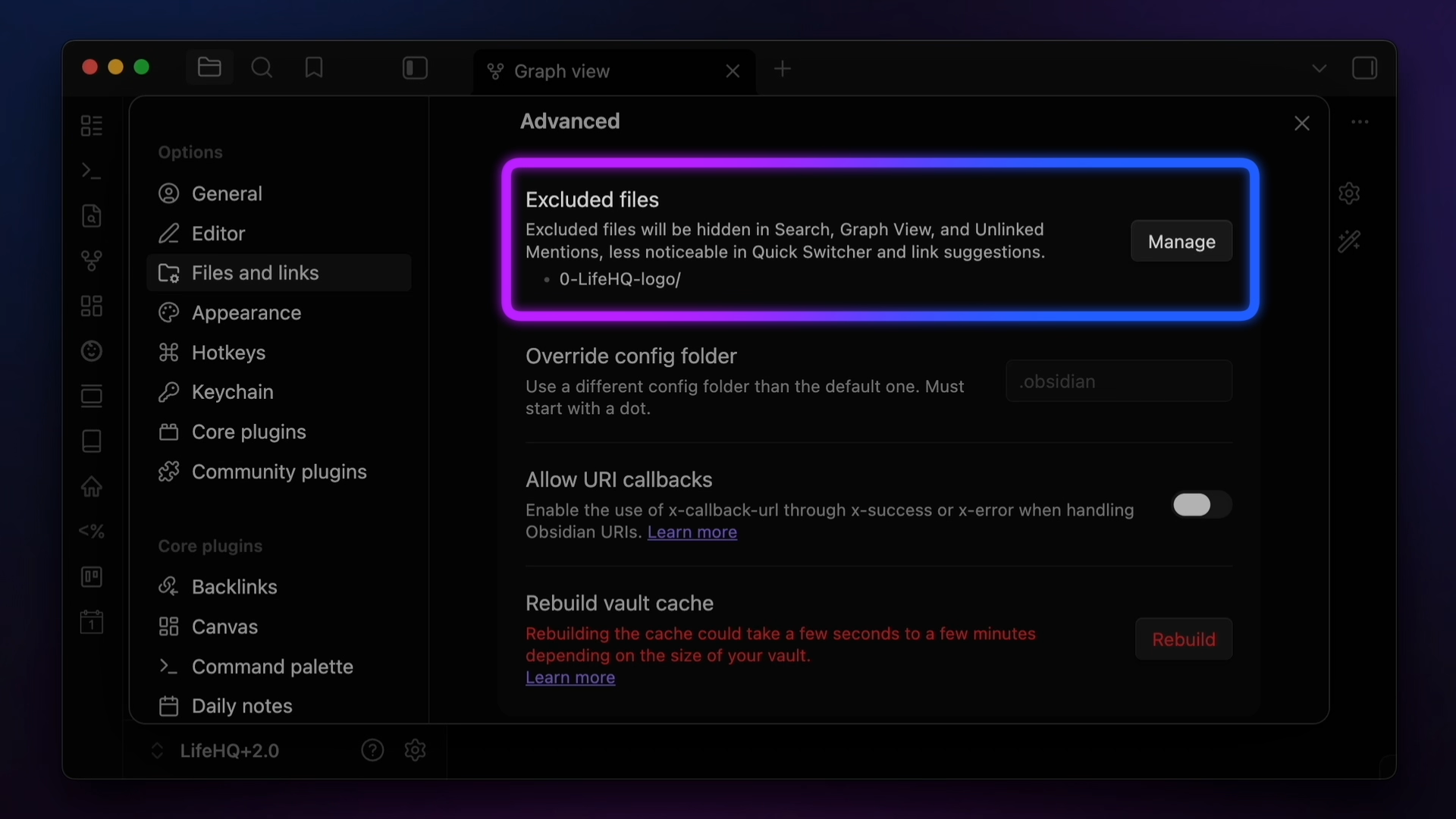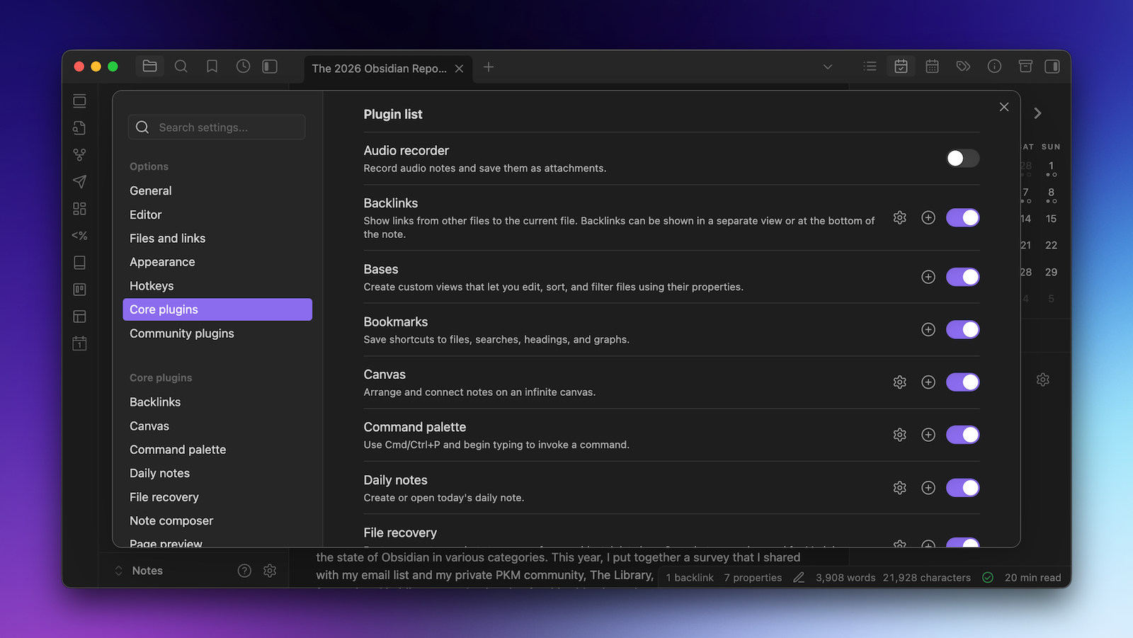 Core plugins are basically Obsidian features that ship with the app that you can toggle on or off depending on your workflow. Just turn off the features you don't want to use in the settings, and they're removed from your Obsidian interface. This lets you dial in the app exactly the way you want it, and lets you clean up features that you're never going to use.