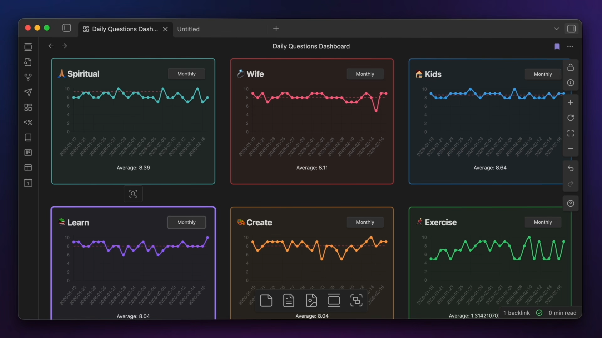 But there is one killer feature Canvas has: the ability to create killer dashboards to visualize the data inside your Obsidian vault. For example, I recently revamped my journaling dashboards with an assist from Claude: