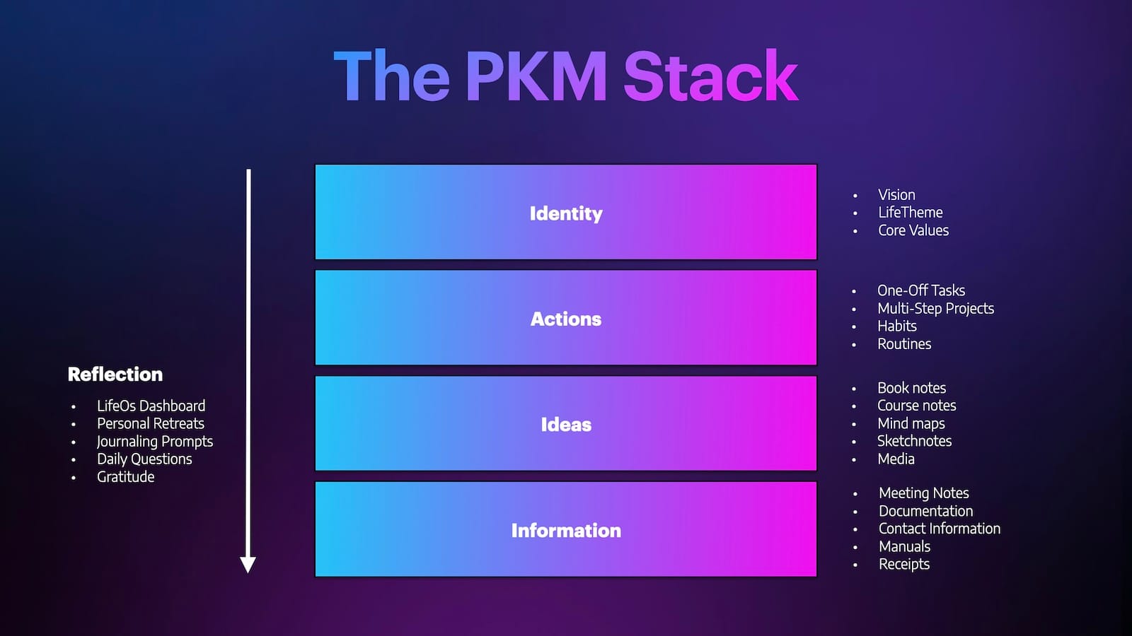 Inside The Library (my private PKM community for serious sensemakers), I teach a framework called The PKM Stack that shows how different levels of personal knowledge management work together to facilitate the flow of information into (and out of) your PKM system. From the tools you choose to use, to the workflows you build, to the information you intentionally consume - your vision and values keep it all in alignment. My LifeTheme sits at the top of that stack as the Identity level, and it’s what gives everything else meaning.