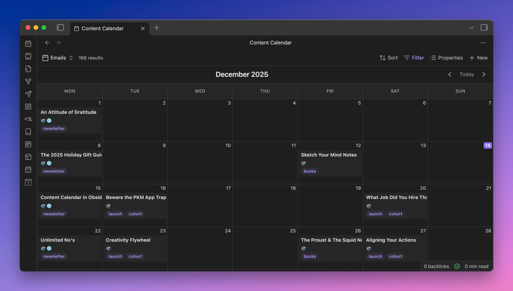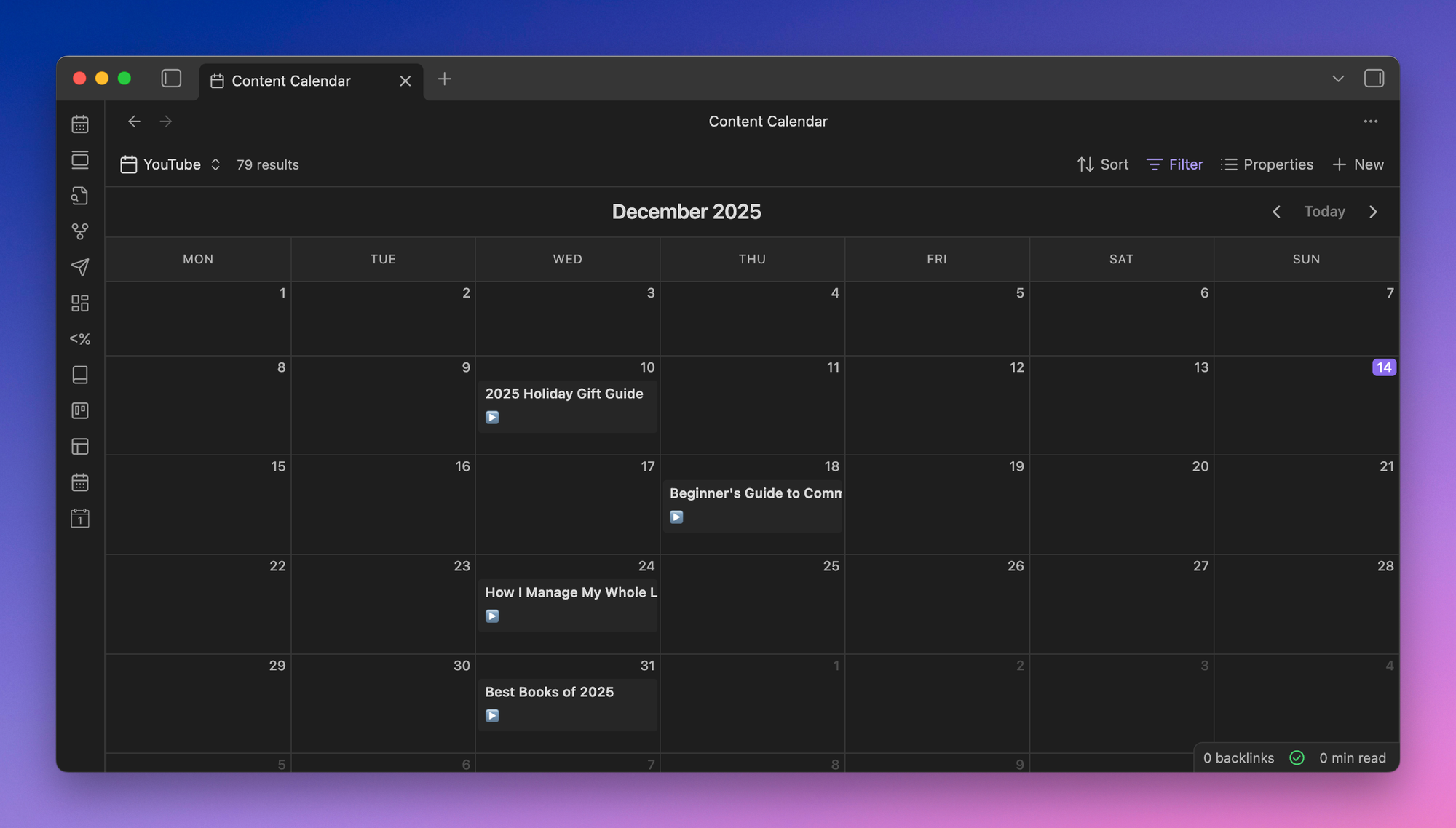 This week, I spent some time figuring out how to create a master content calendar in Obsidian.
