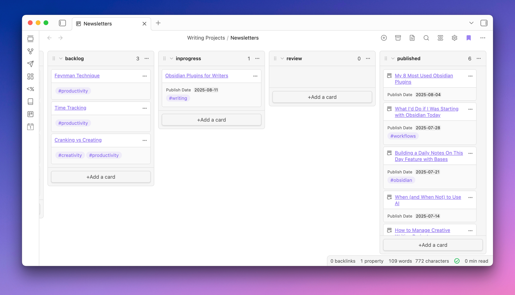 The Kanban plugin turns a Markdown note into a Kanban board. And since you can link to other notes in your card titles, the Kanban plugin is a great way to manage your active writing projects.