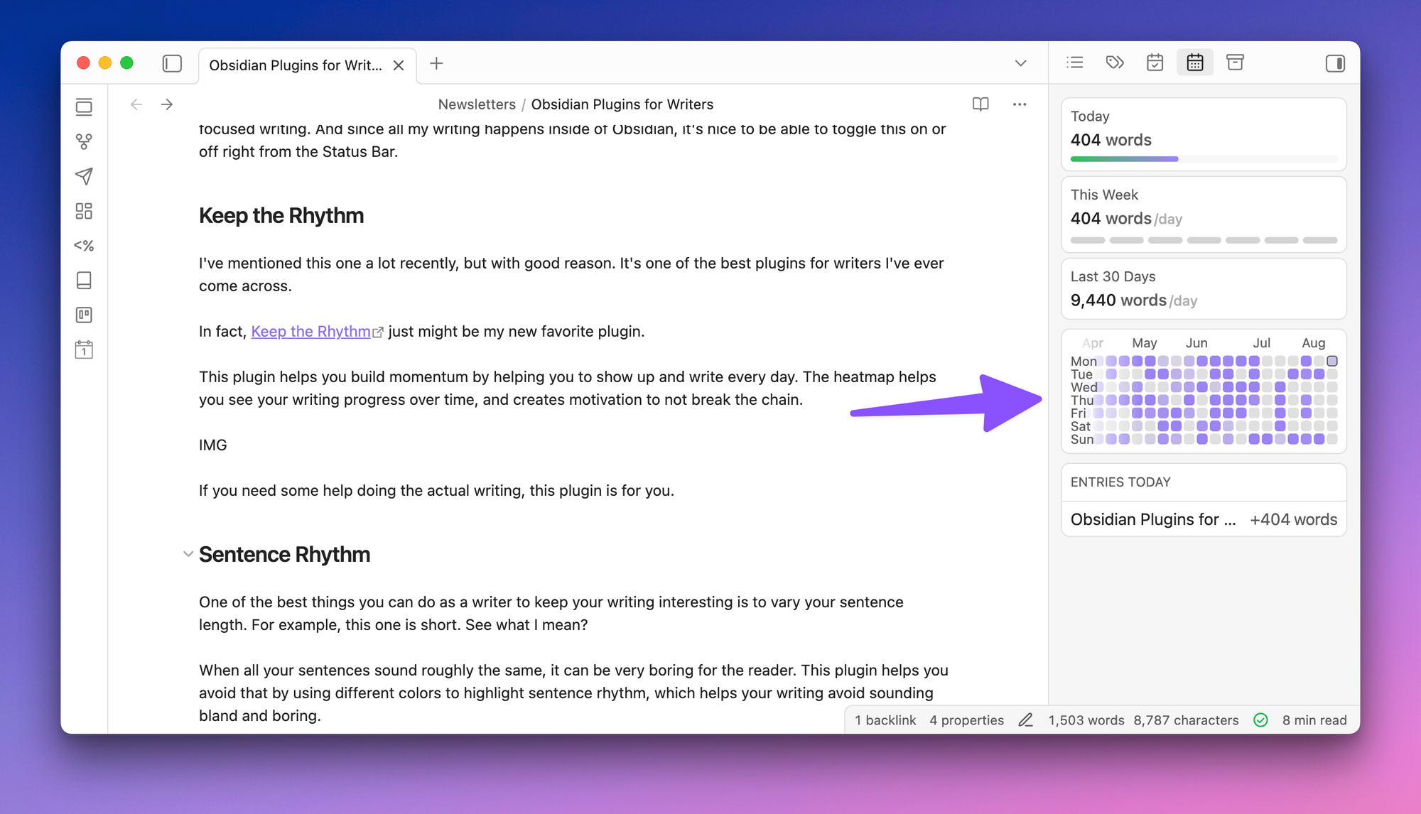 This plugin helps you build momentum by helping you to show up and write every day. The heatmap helps you see your writing progress over time and creates motivation to not break the chain.