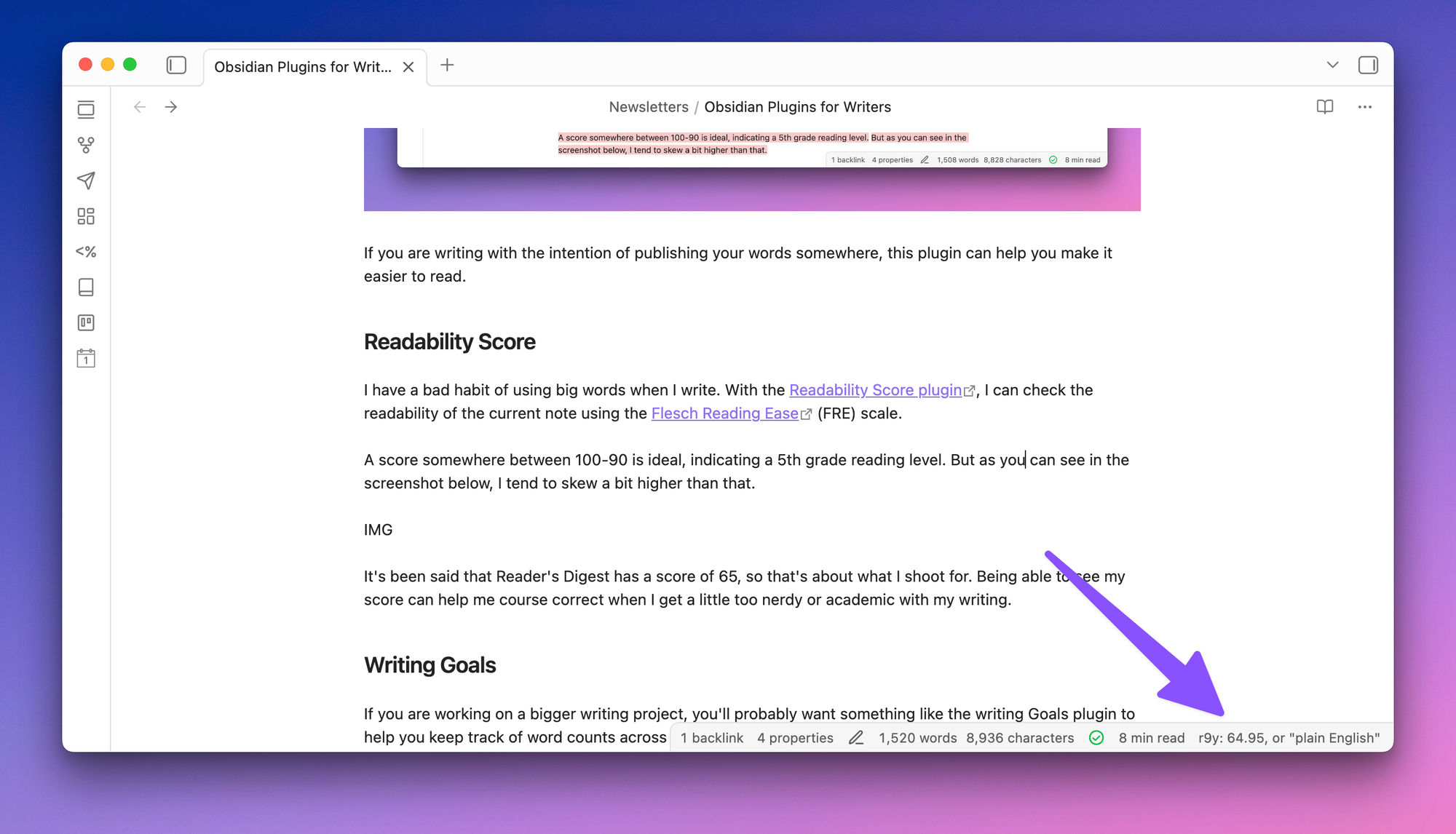 I have a bad habit of using big words when I write. With the Readability Score plugin, I can check the readability of the current note using the Flesch Reading Ease (FRE) scale.