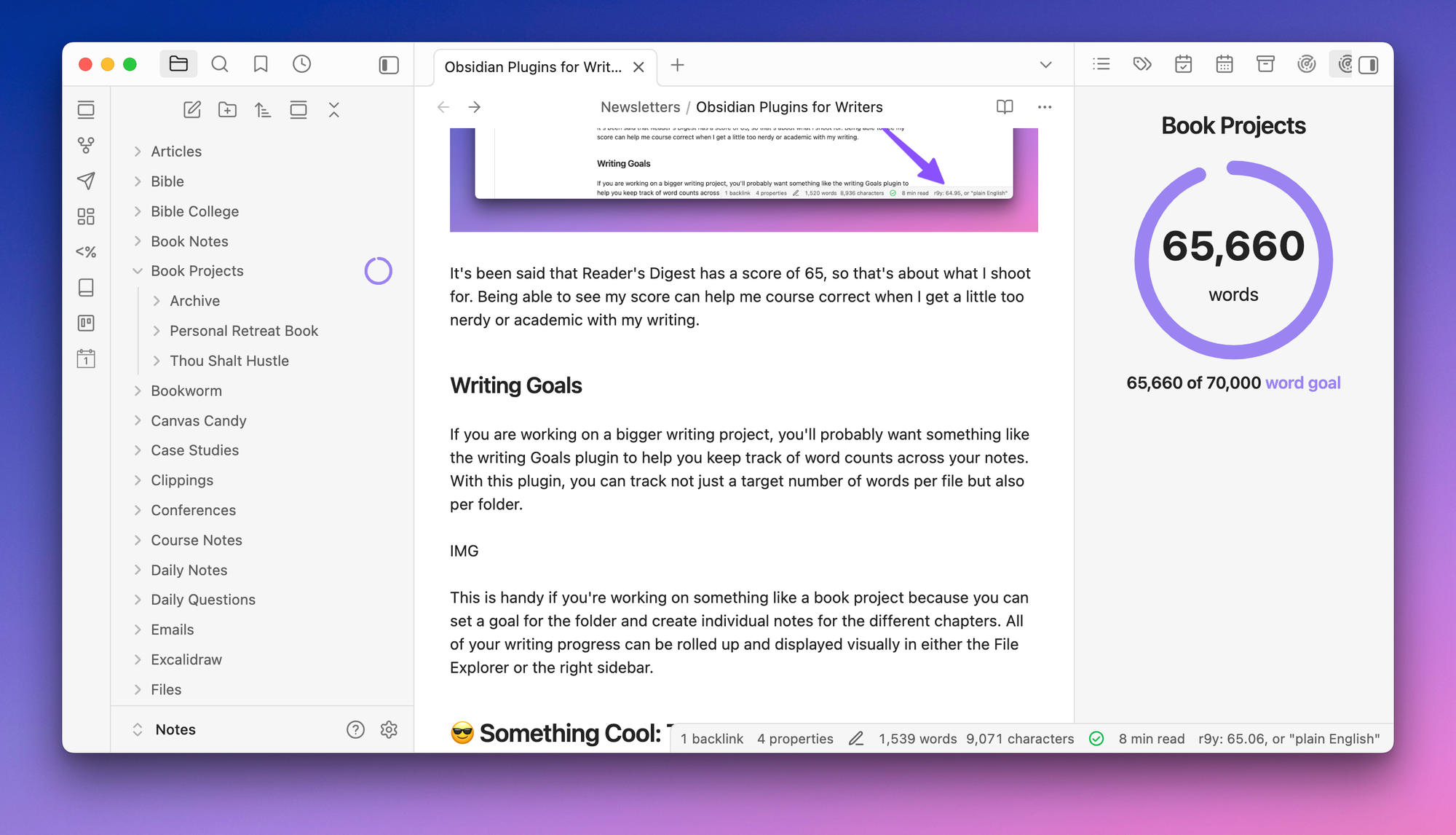 This is handy if you're working on something like a book project because you can set a goal for the folder and create individual notes for the different chapters. All of your writing progress can be rolled up and displayed visually in either the File Explorer or the right sidebar.