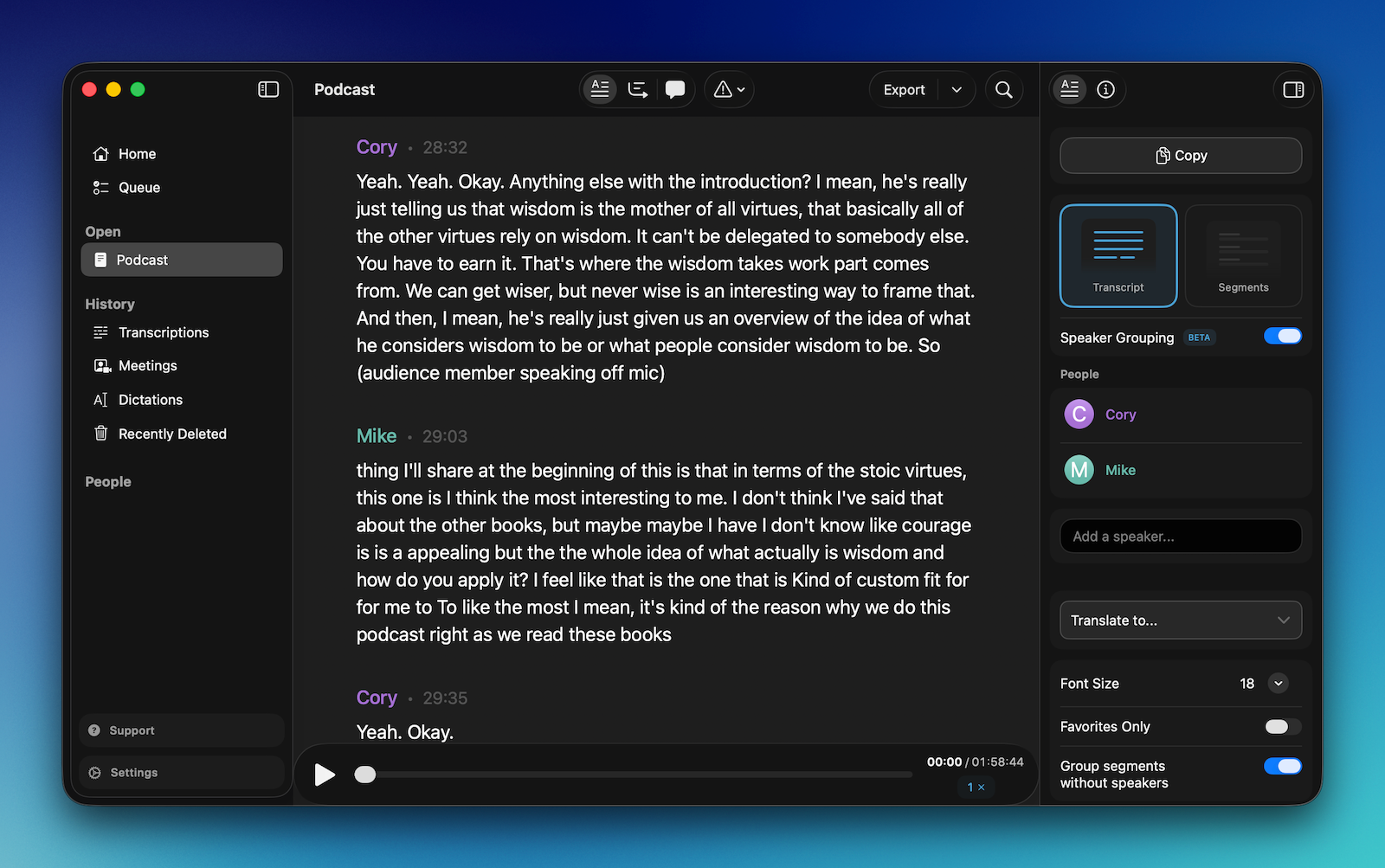 I use MacWhisper to transcribe both sides of the podcast audio from the Dropbox folder where we keep everything. This only takes a couple of minutes, and it gives me a clean transcript I can attach when I run the skill.