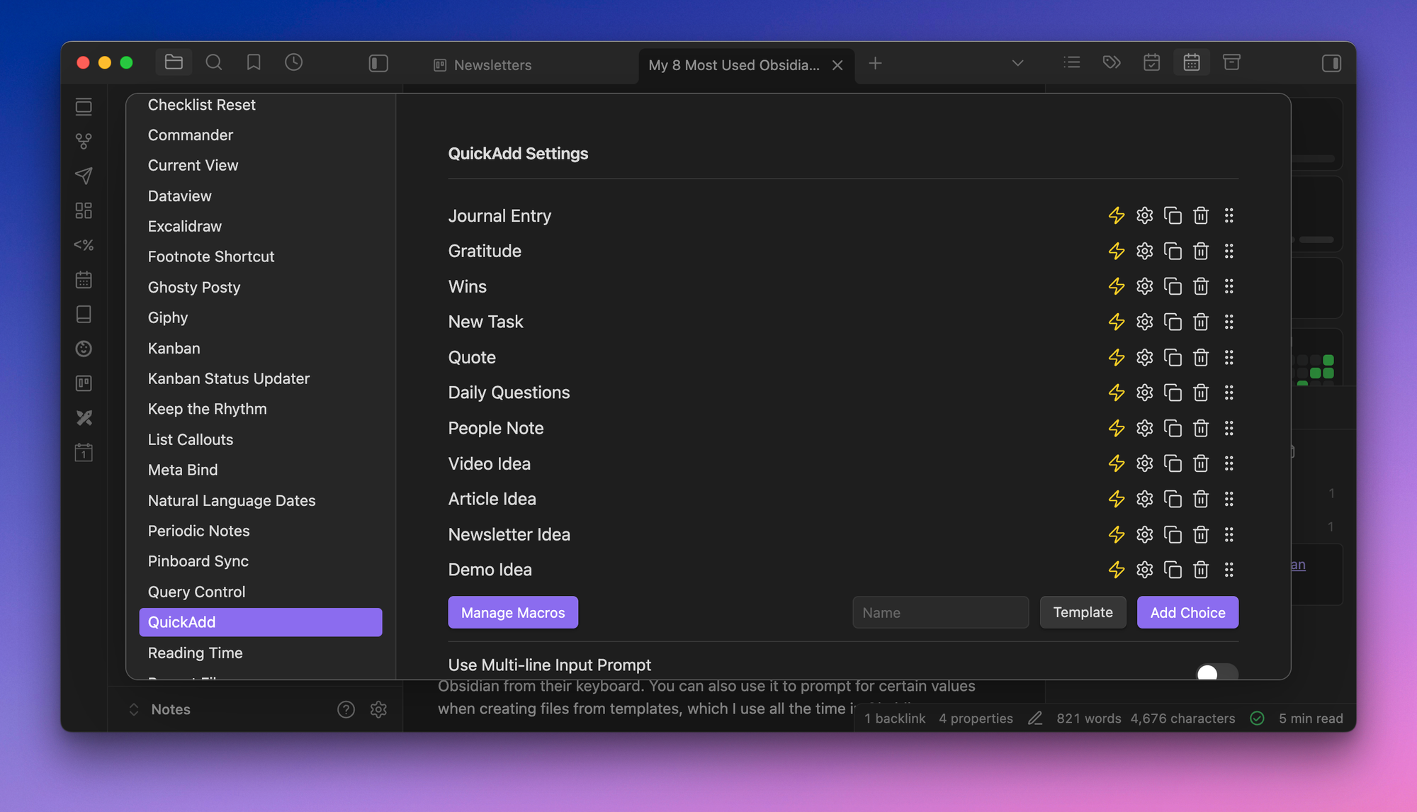 This plugin lets you create custom macros for automating things in Obsidian. It may not look like much at first, but once you start figuring out how to tie things together, this plugin quickly becomes essential for those who want to control Obsidian from their keyboard. You can even use this to prompt for certain values when creating files from templates.