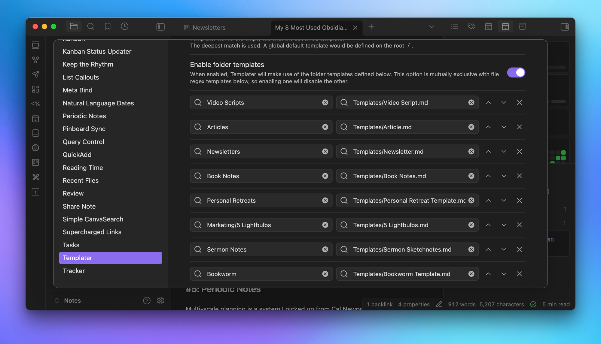 Think of this community plugin as Templates++. While you can certainly get by with the built-in Templates core plugin, if you really want to automate things, you’ll eventually need to upgrade to Templater. In addition to extra template variables, this plugin also lets you do some pretty advanced things, like control the placement of the mouse cursor when creating files.
