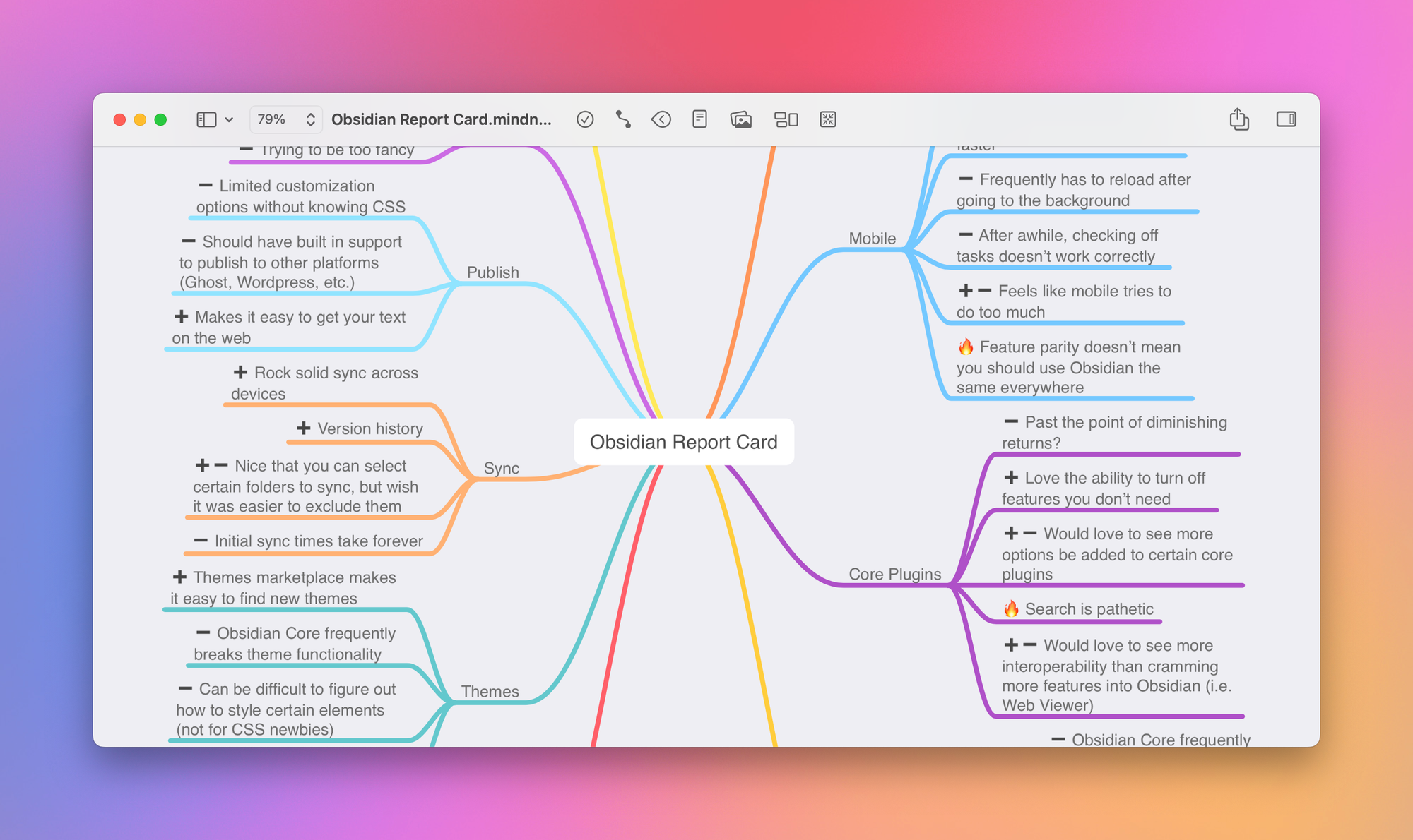 Earlier this year, I published an Obsidian Report Card video on my YouTube channel. While planning this video, I created a mind map with branches for each section I wanted to cover: desktop, mobile, core plugins, community plugins, etc.. Under each section, I added nodes denoted with emojis: