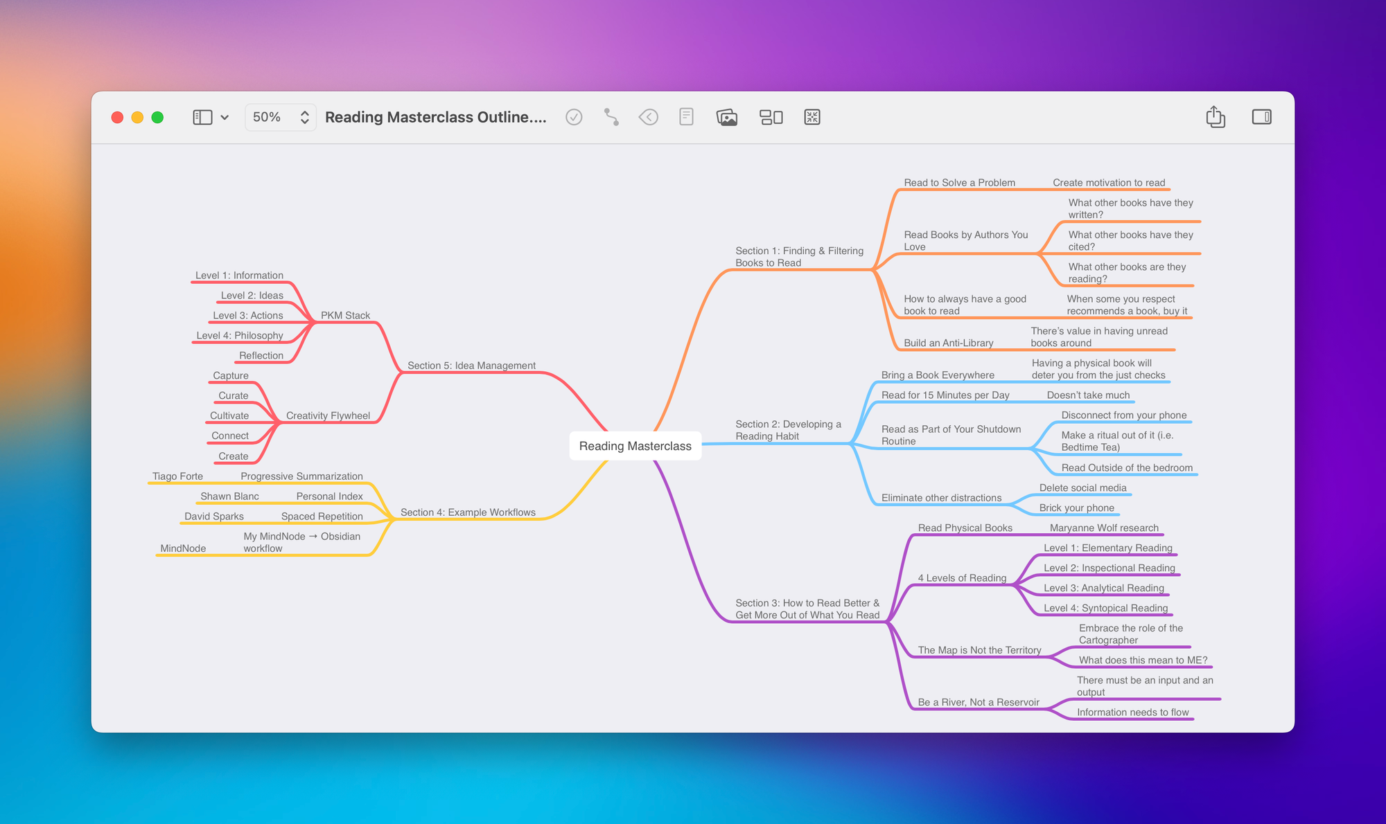Last summer, I presented a three-hour Reading Masterclass workshop. But before I made the presentation, I created a mind map to nail down the flow. Each major section had its own branch with child nodes for the key points I wanted to cover: