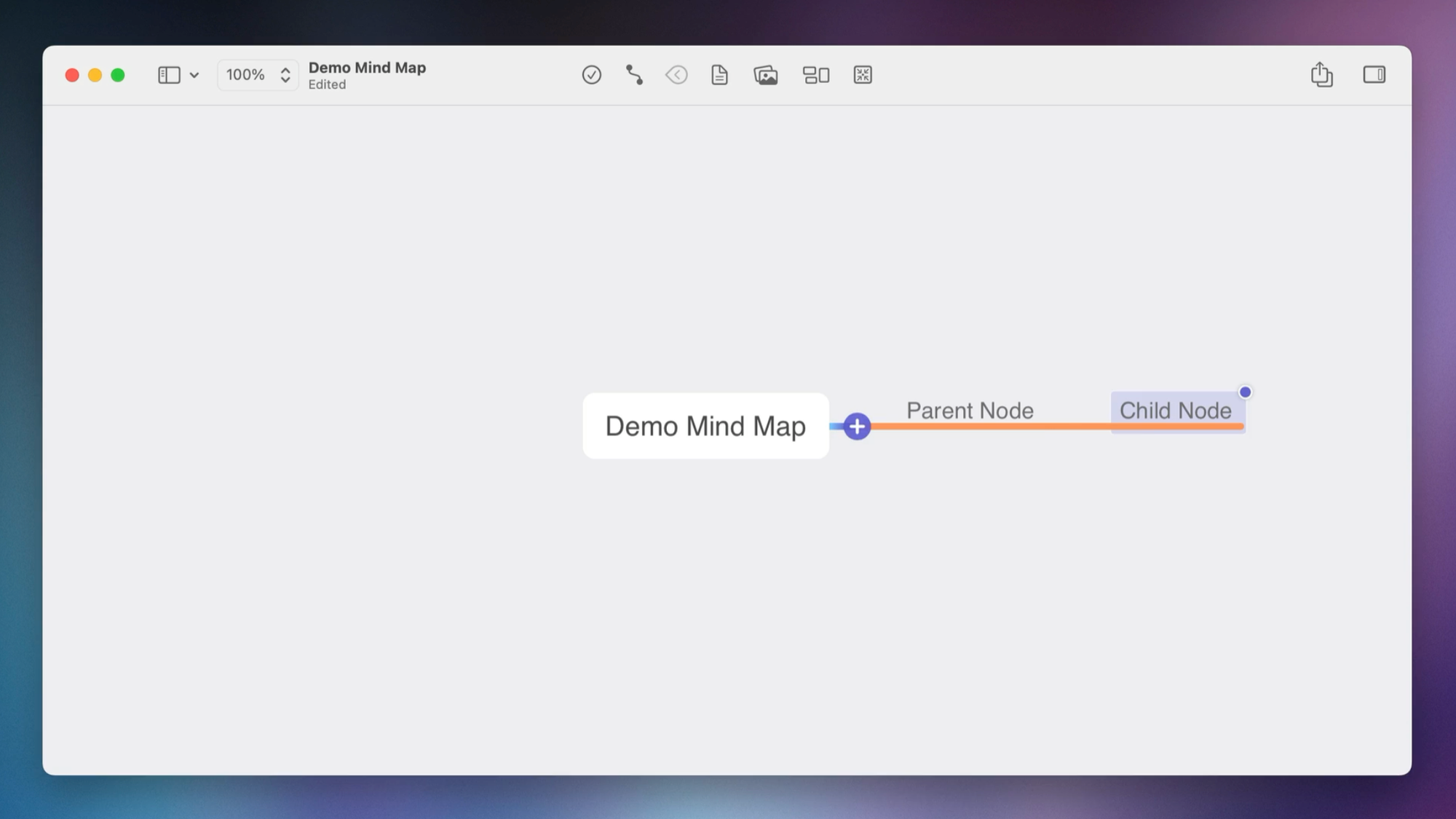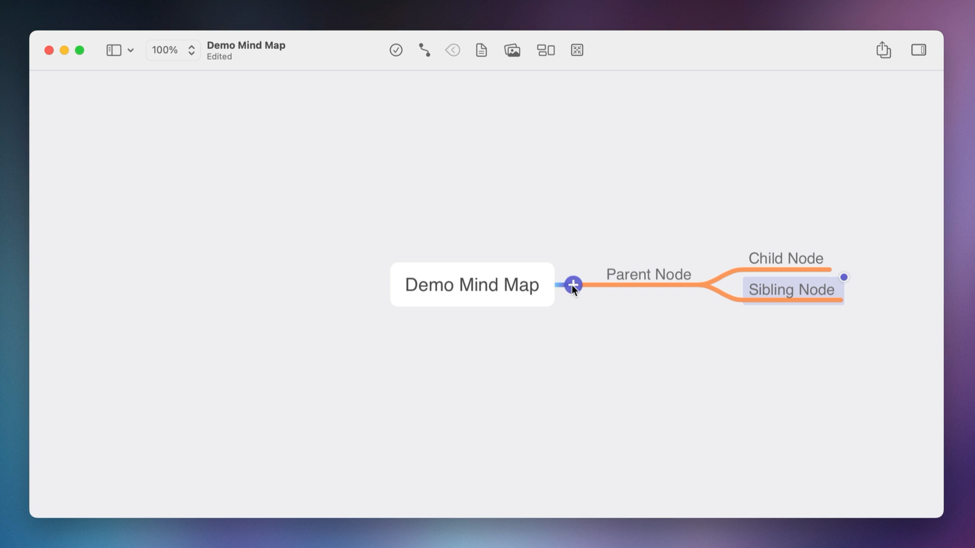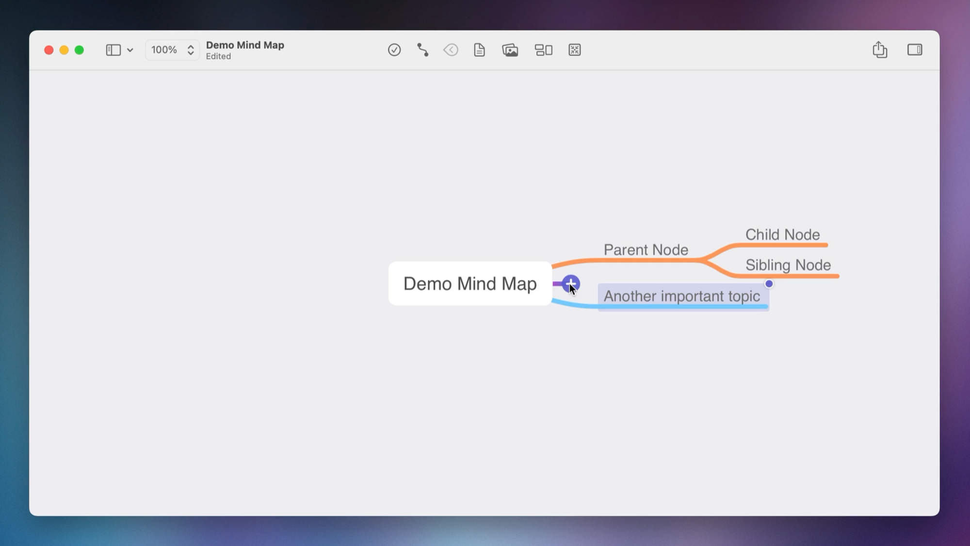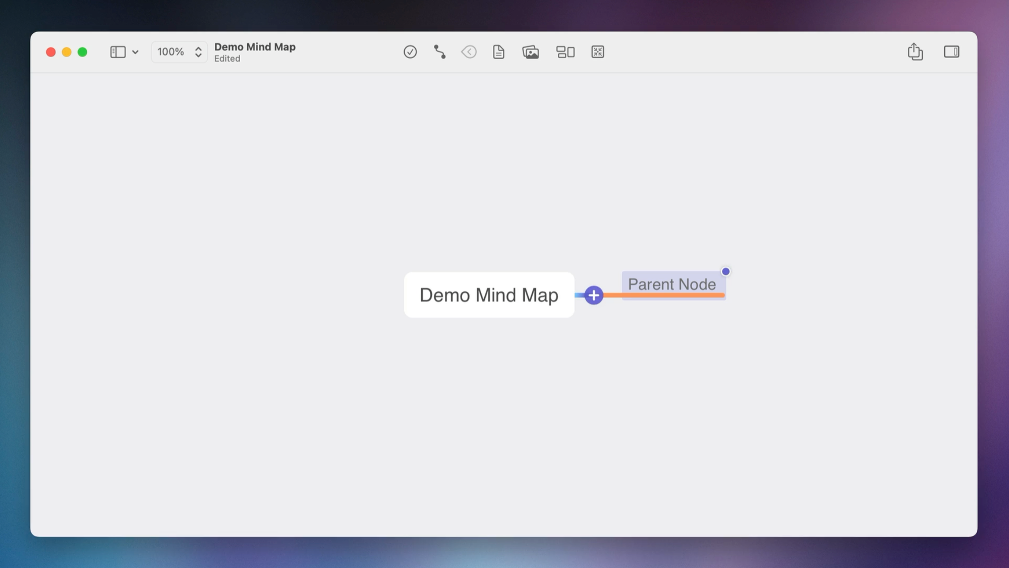 Next, we'll add our first node. With MindNode, you can hover over the main node and click the + to create a new node, which we'll call "Parent node."