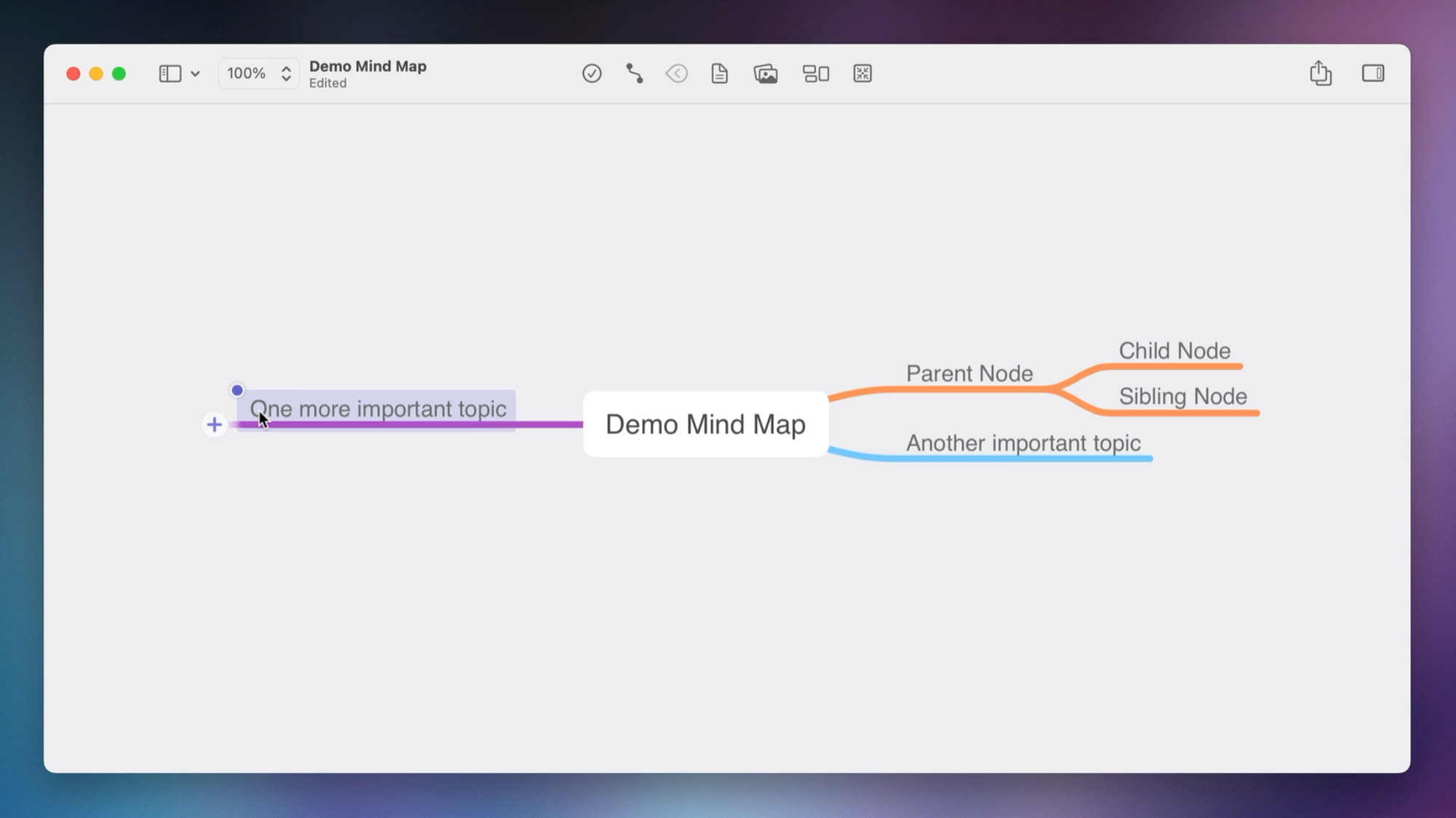 Again, let's create a new branch (this one is purple), and we'll call this "One more important topic." Let's also drag this branch to the other side of the mind map, and then when we release it, MindNode automatically cleans things up so that everything is balanced.