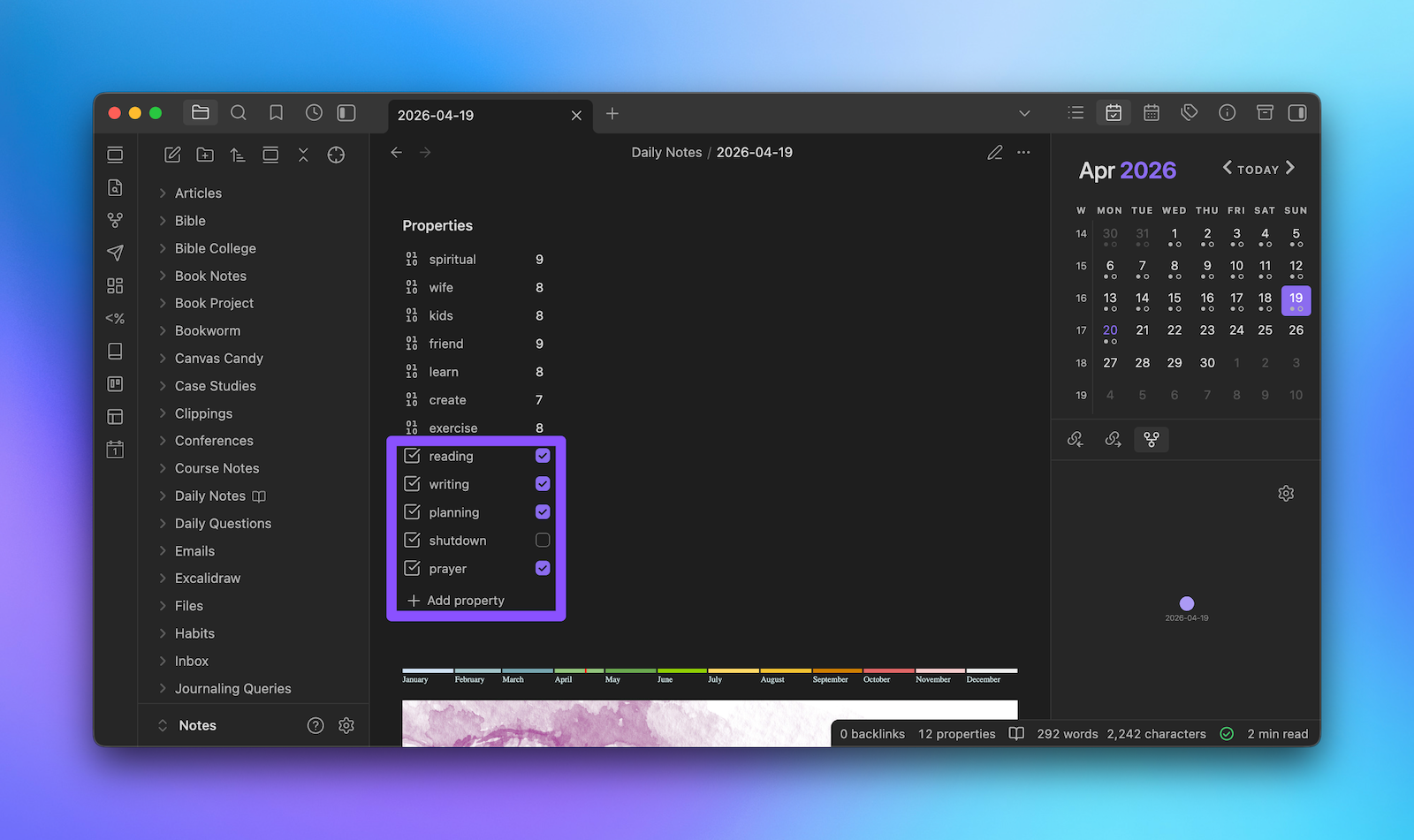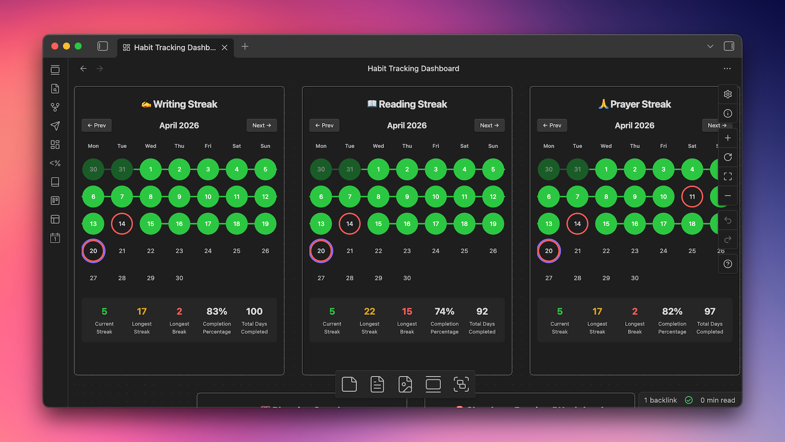Say I pull up the dashboard during my quarterly Personal Retreat and I see a 12-day gap in my writing habit back in October. My first question isn’t “why did I miss so much?” It’s “what was going on during those 12 days?” So I click into the first daily note in the gap. Maybe I find out I was prepping for a conference that week. The next note mentions I got sick. The next few notes show I was playing catch-up on everything I missed. By the time I’m done, I’ve reconstructed the whole story — and now I can ask a much better question. Not “how do I never miss again?” but “what’s my system for protecting this habit during high-stress weeks like this?”