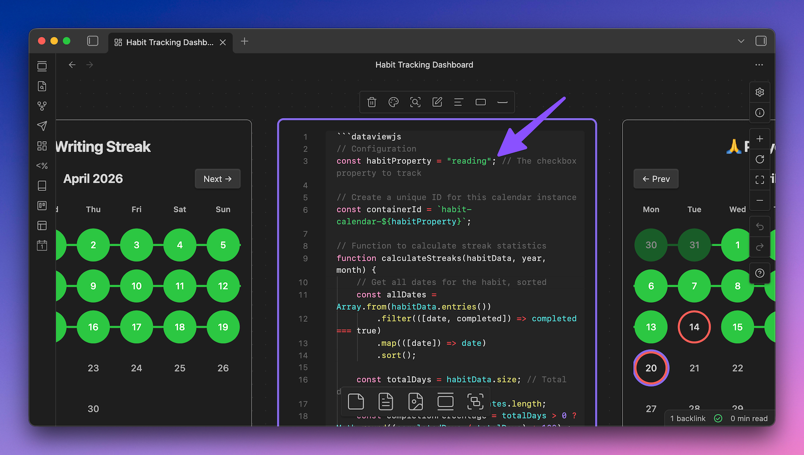 If you want to track a different habit, just update the property in your Daily Note template file and update this line of code to match.