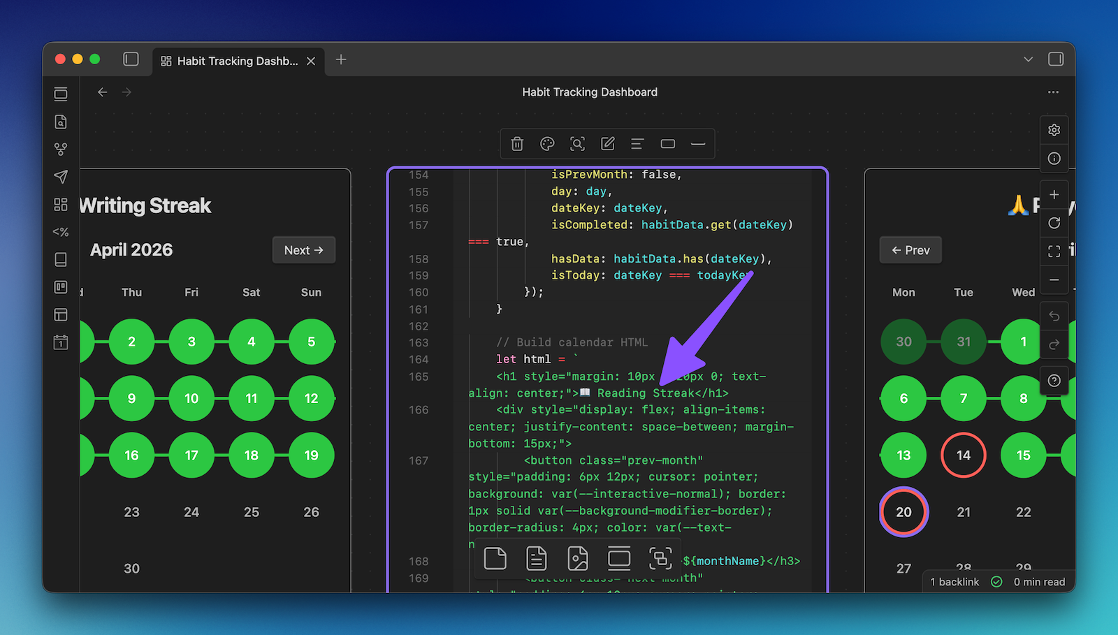 My habit tracking dashboard is built as a Canvas file in Obsidian. Each habit gets its own card and its own code snippet. Each card shows a month-view calendar laid out Monday through Sunday, with completed days as solid green circles and missed days as red rings. When you hit consecutive days, green lines connect them across the calendar, so your streak literally becomes a visible chain. You can also navigate between months, and click any date, and you’re in the daily note for that day.